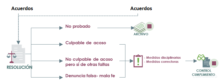 • Adopción de las medidas de todo orden, incluidas en su caso las de carácter disciplinario, contra la/s persona/s cuya/s conducta/s de acoso resulten acreditadas. Igualmente se considera reprobable y merecedora de reproche toda imputación, acusación o denuncia falsa en relación a estos comportamientos, adoptándose las medidas que sean necesarias.